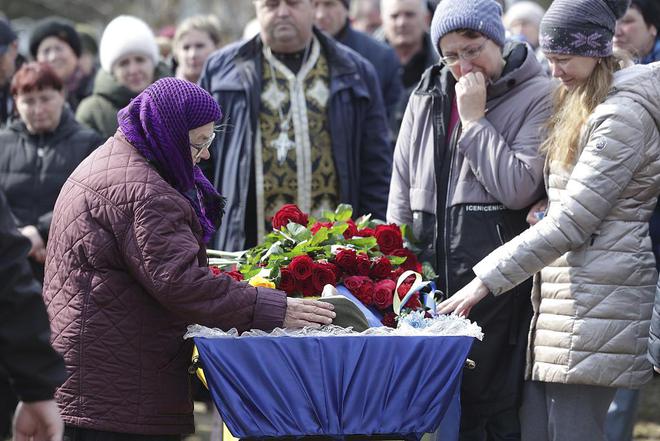 当地时间2023年3月7日,乌克兰巴赫穆特,民众参加为军事行动中丧生的乌克兰士兵举行的葬礼。视觉中国 图