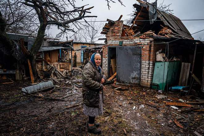 当地时间2023年2月28日,顿涅茨克地区,巴赫穆特附近的恰索夫亚尔,一名妇人站在炮击后的后院。视觉中国 资料图